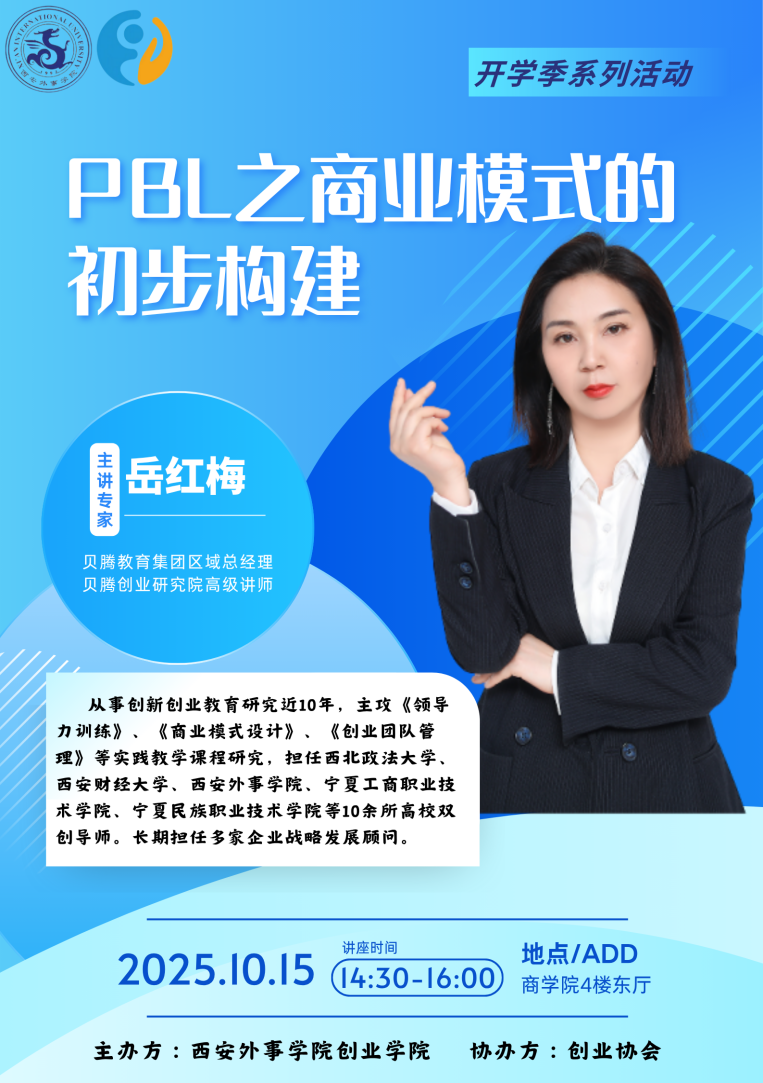 10月15日下午,由西安外事学院创业学院主办,创业协会协办的“开学季——PBL之商业模式的初步构建”主题讲座,在商学院4楼东厅顺利举行。活动邀请贝腾教育集团区域总经理、贝腾创业研究院高级讲师岳红梅担任主讲嘉宾,创业学院党支部书记、副院长贾怀忠,创业协会指导老师栾琪以及创业协会师生共150余人参加本次活动。